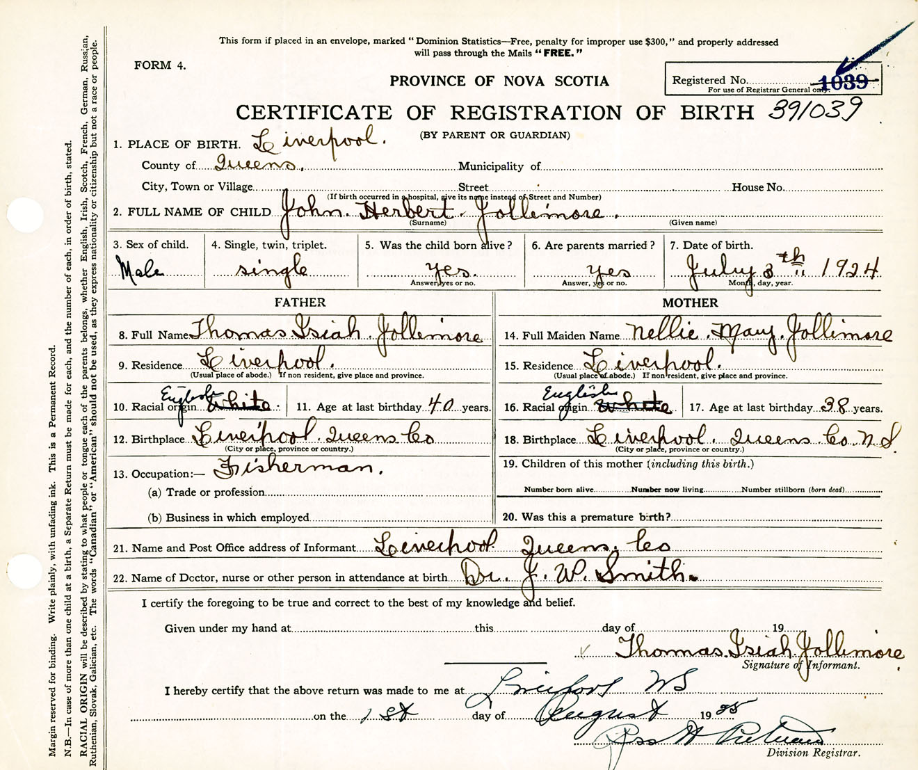 Male Birth Registration: Year: 1924 number: 39100039