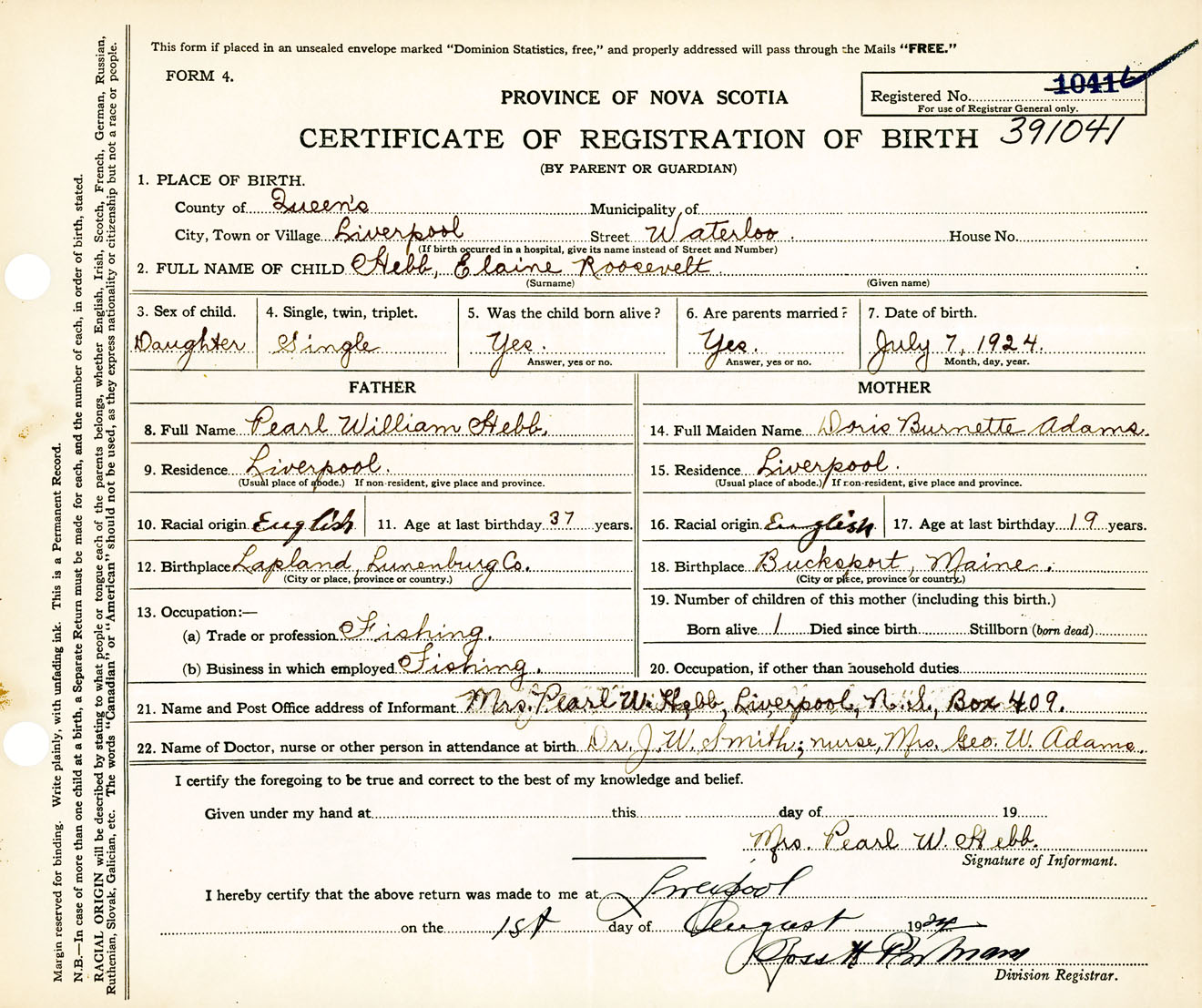 Female Birth Registration: Year: 1924 number: 39100041