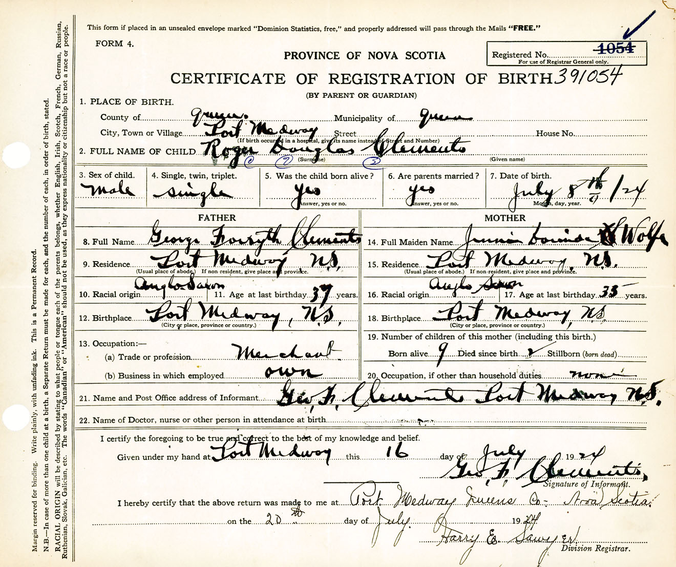 Male Birth Registration: Year: 1924 number: 39100054
