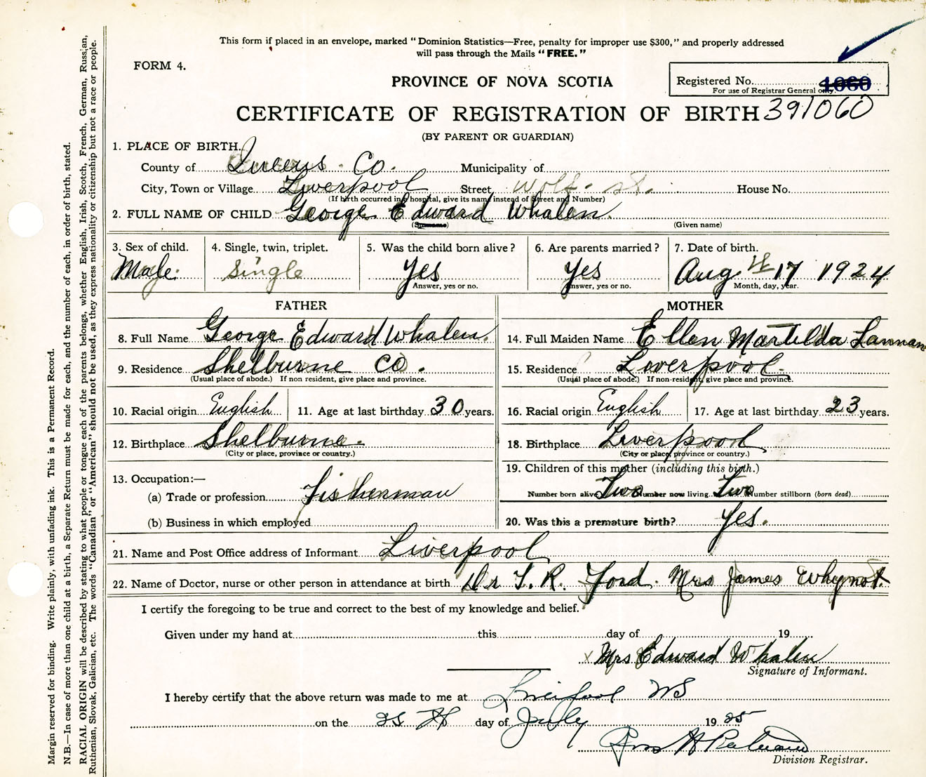 Male Birth Registration: Year: 1924 number: 39100060