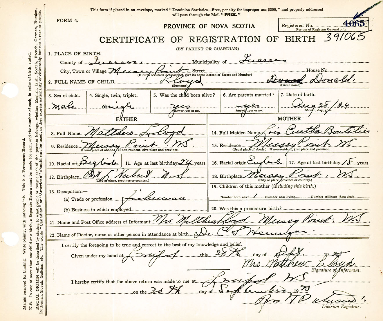 Male Birth Registration: Year: 1924 number: 39100065