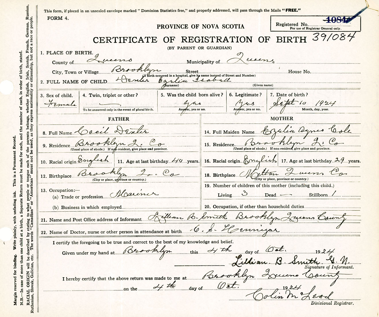Female Birth Registration: Year: 1924 number: 39100084