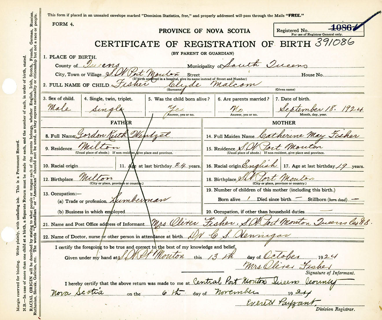 Male Birth Registration: Year: 1924 number: 39100086