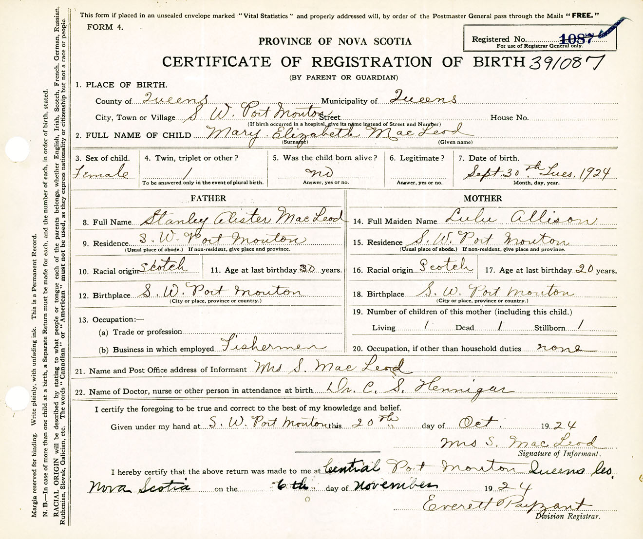Female Birth Registration: Year: 1924 number: 39100087