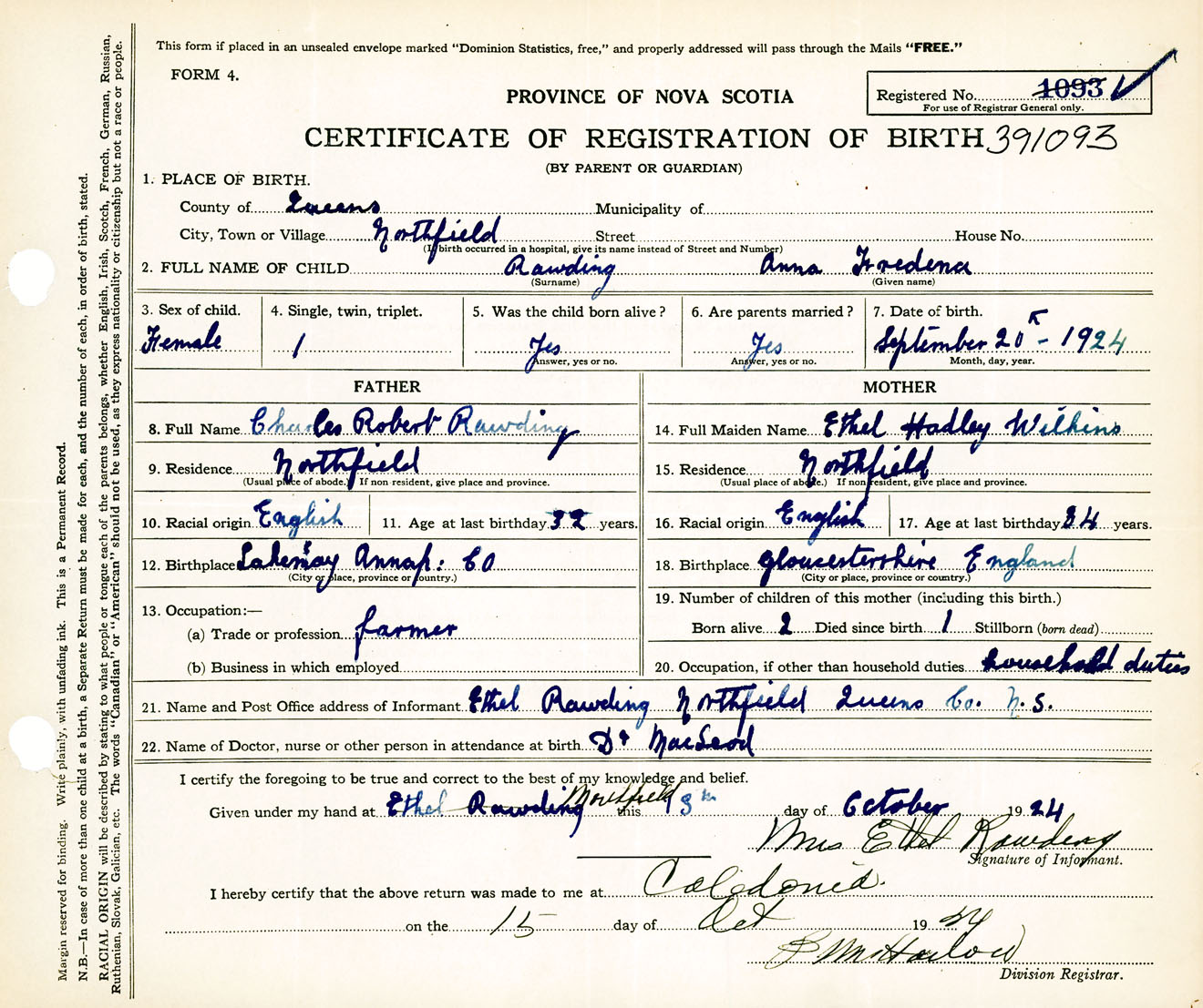 Female Birth Registration: Year: 1924 number: 39100093