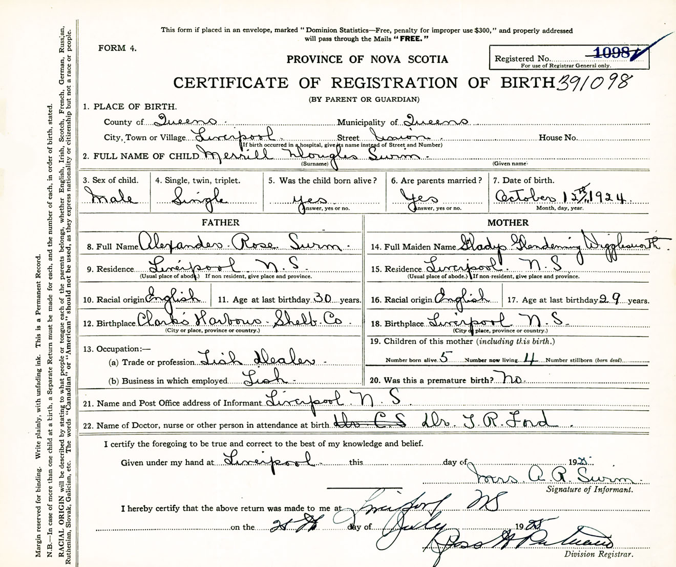 Male Birth Registration: Year: 1924 number: 39100098