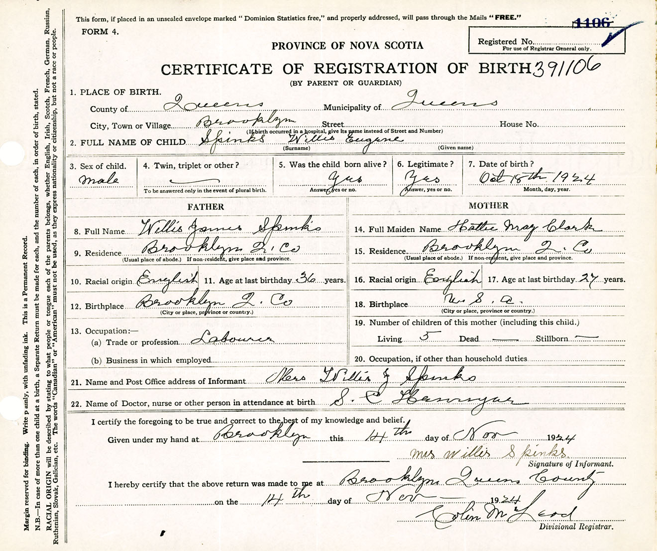 Male Birth Registration: Year: 1924 number: 39100106