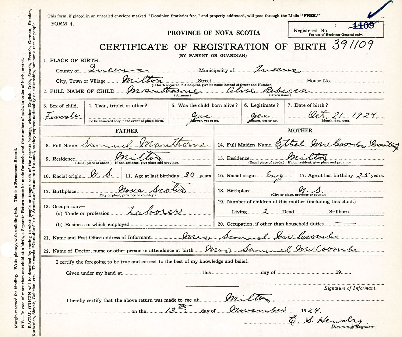 Female Birth Registration: Year: 1924 number: 39100109