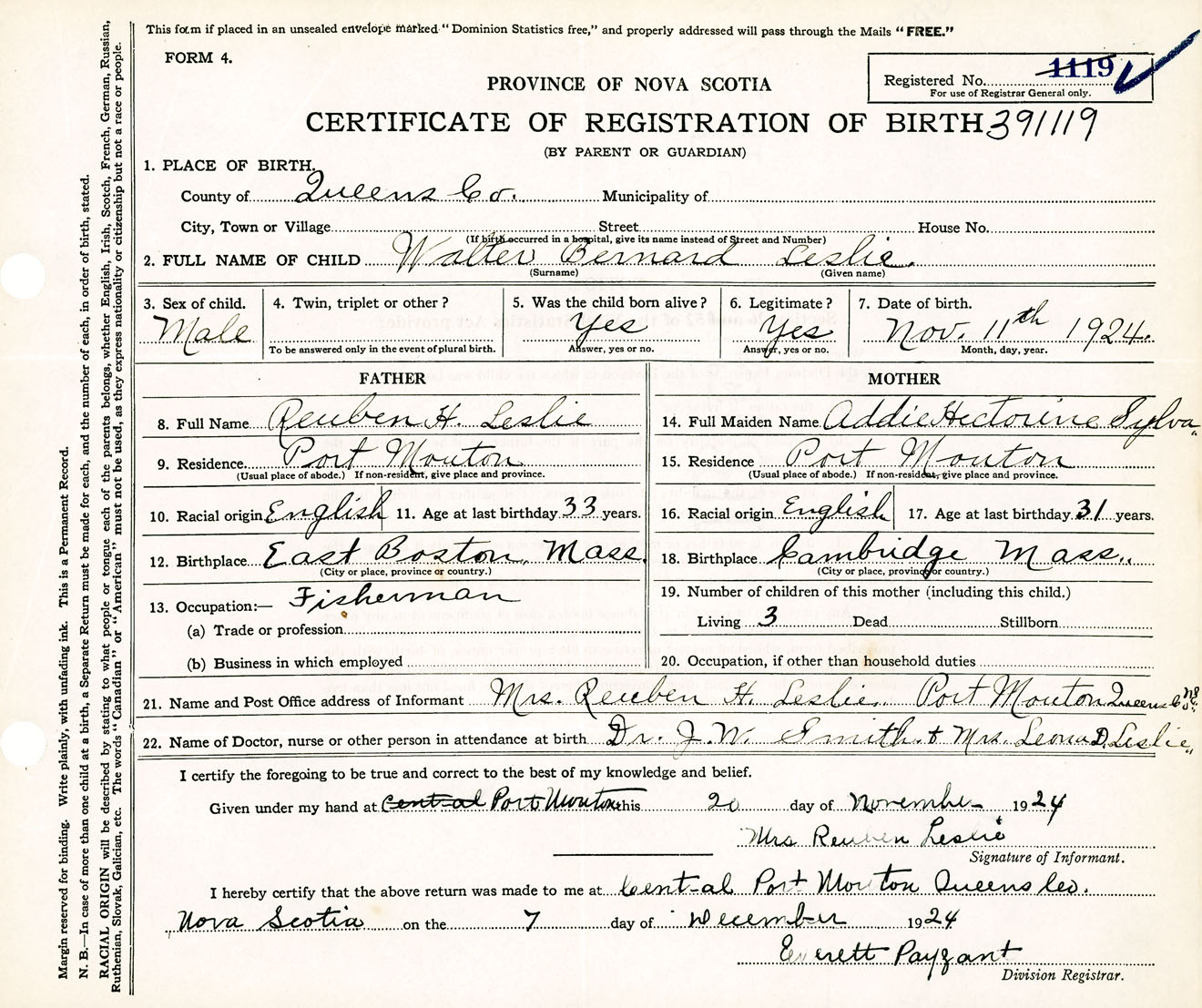 Male Birth Registration: Year: 1924 number: 39100119