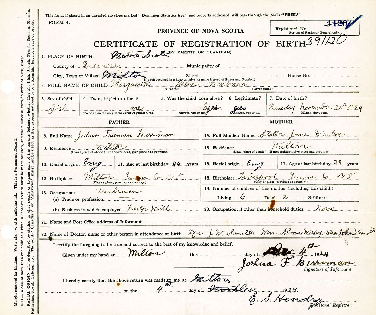 Female Birth Registration: Year: 1924 number: 39100120