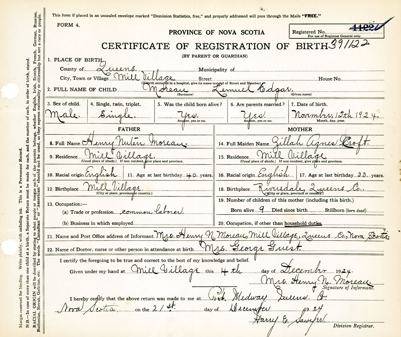 Male Birth Registration: Year: 1924 number: 39100122