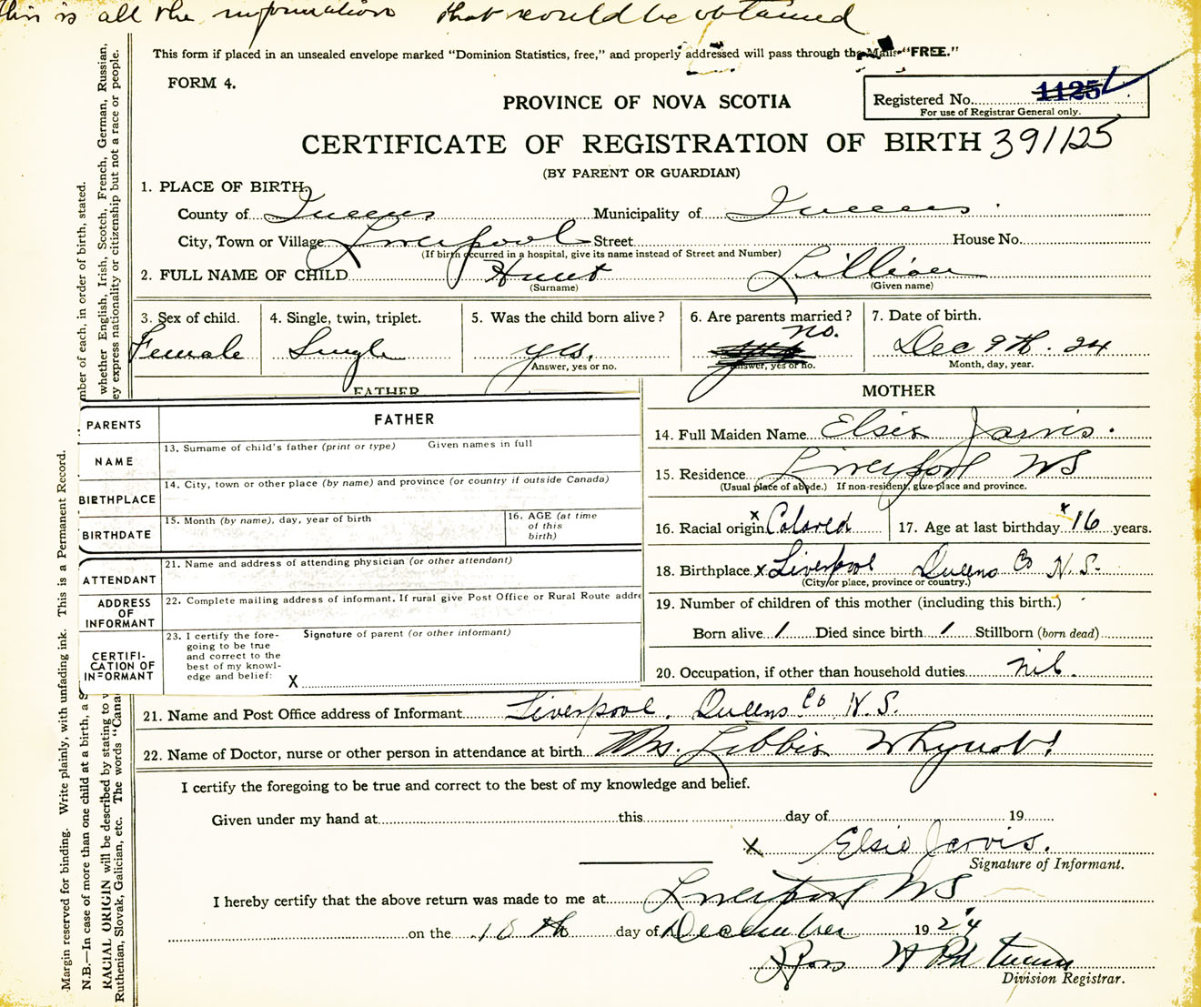 Female Birth Registration: Year: 1924 number: 39100125