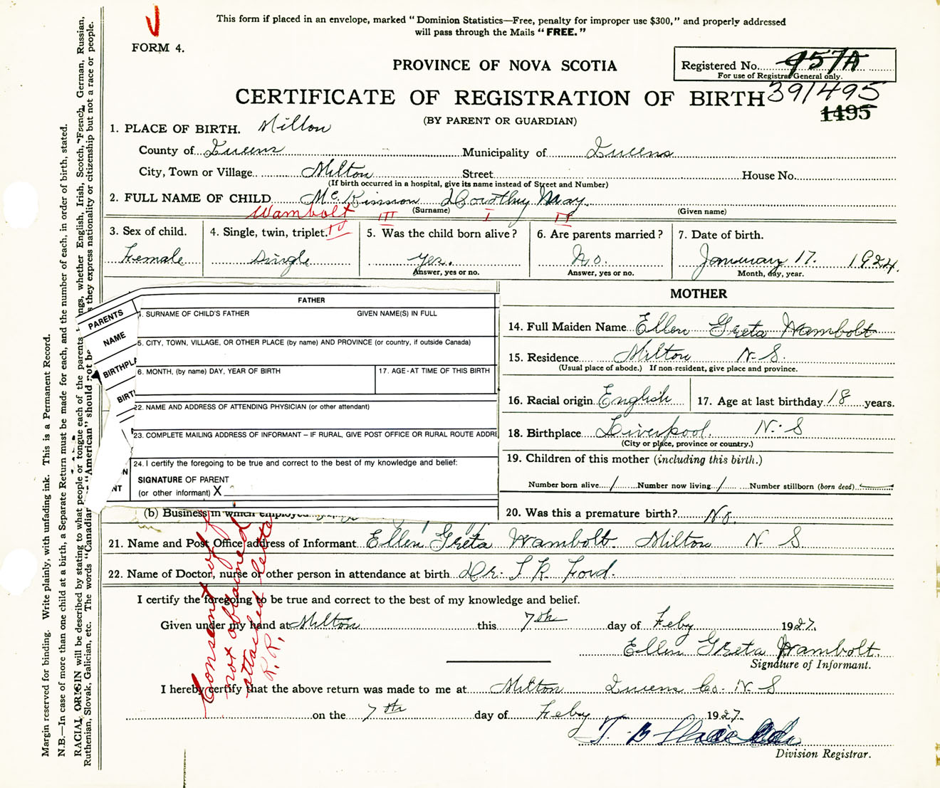 Female Birth Registration: Year: 1924 number: 39100495