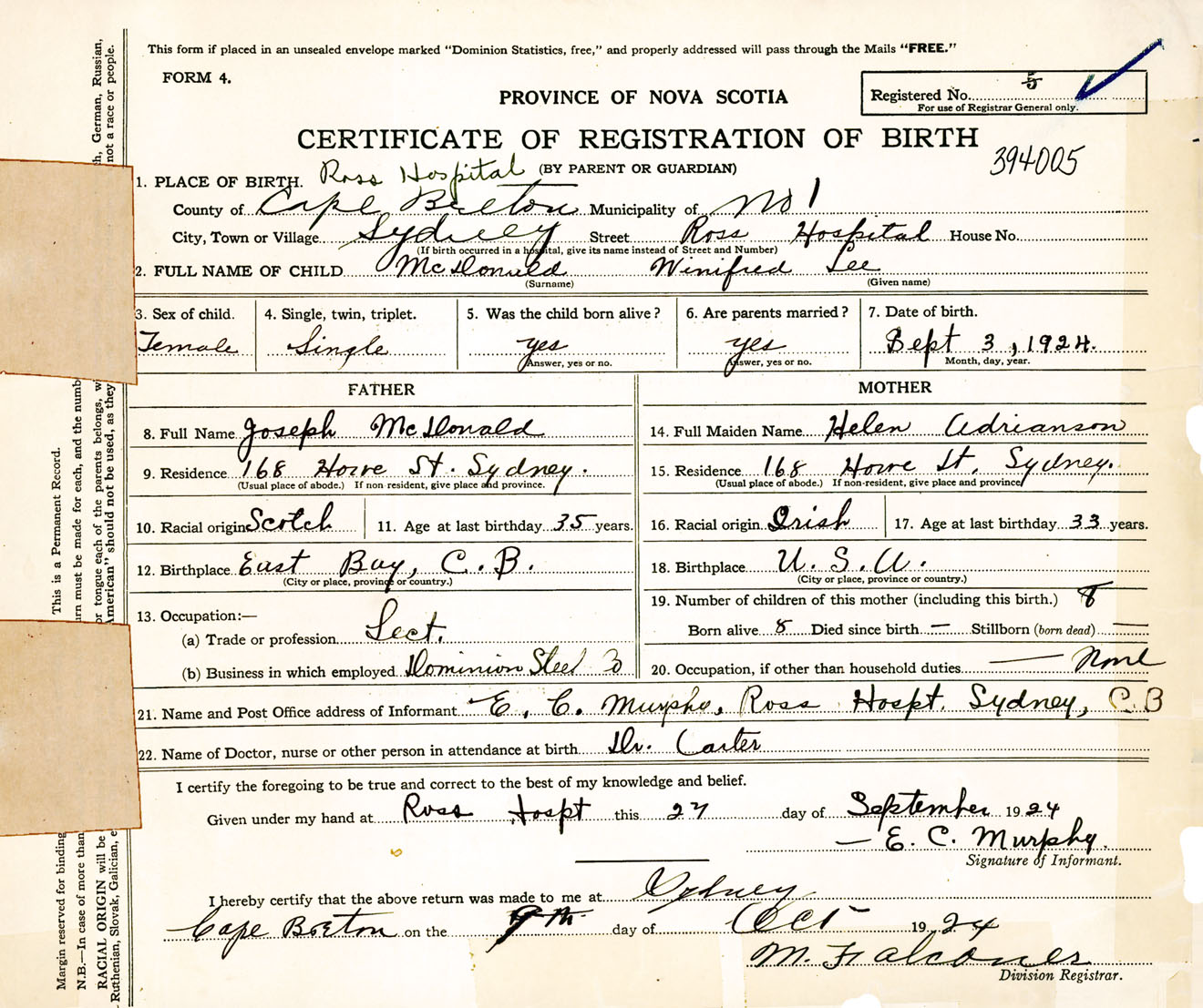Female Birth Registration: Year: 1924 number: 39400005