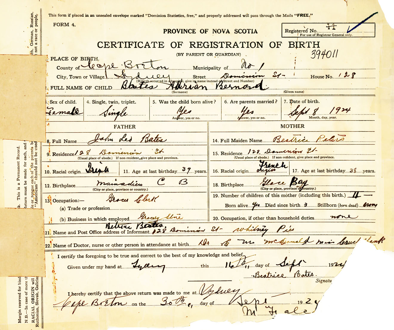 Female Birth Registration: Year: 1924 number: 39400011