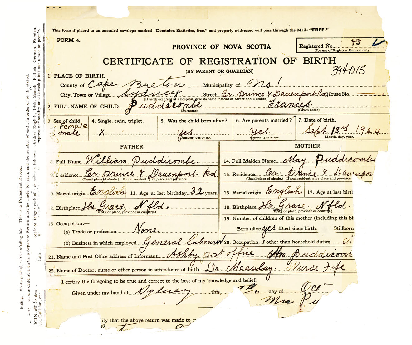 Female Birth Registration: Year: 1924 number: 39400015