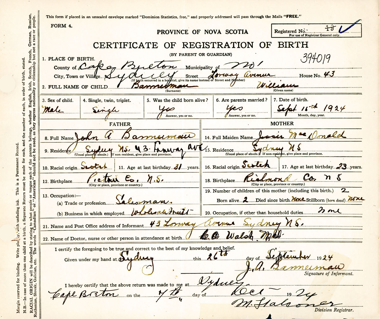 Male Birth Registration: Year: 1924 number: 39400019