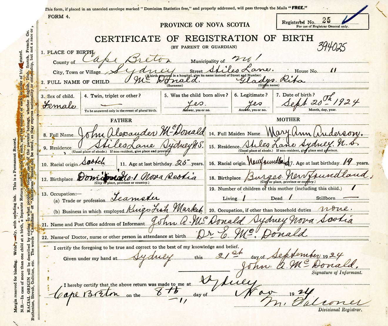 Female Birth Registration: Year: 1924 number: 39400025