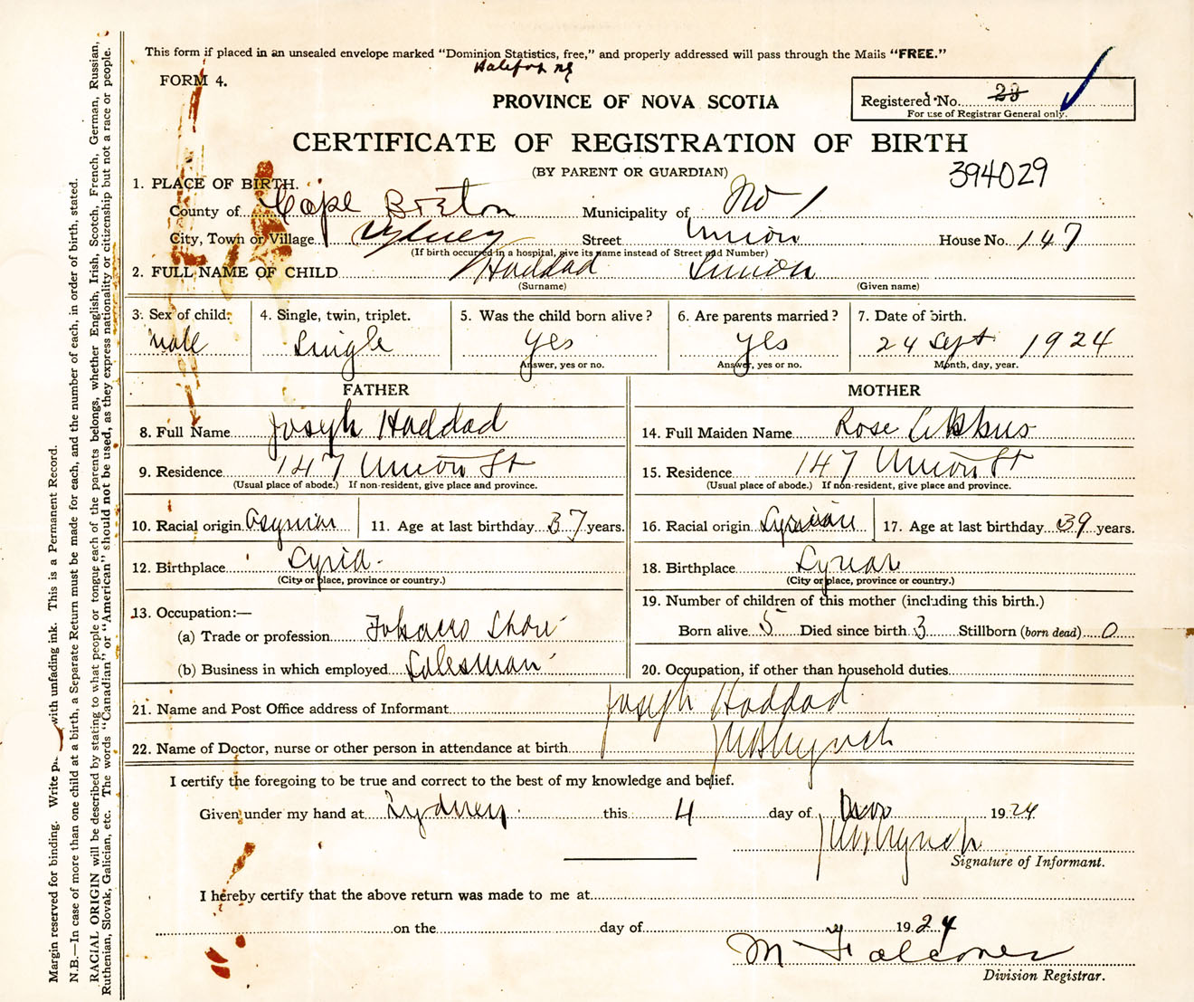 Female Birth Registration: Year: 1924 number: 39400029