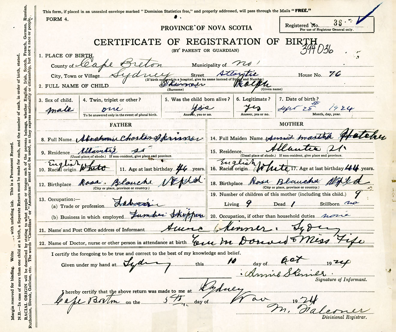 Male Birth Registration: Year: 1924 number: 39400036