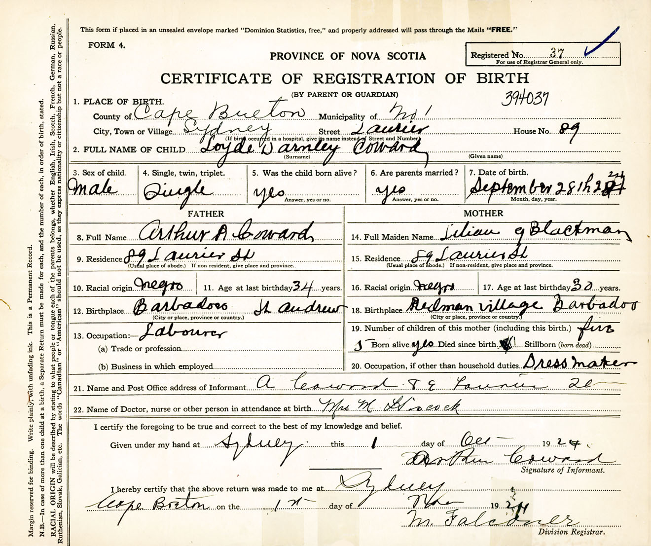 Male Birth Registration: Year: 1924 number: 39400037