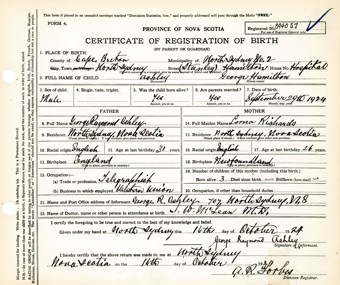 Male Birth Registration: Year: 1924 number: 39400057