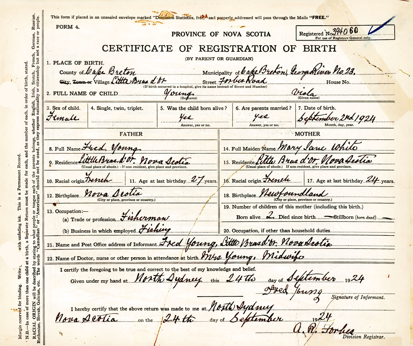 Female Birth Registration: Year: 1924 number: 39400060