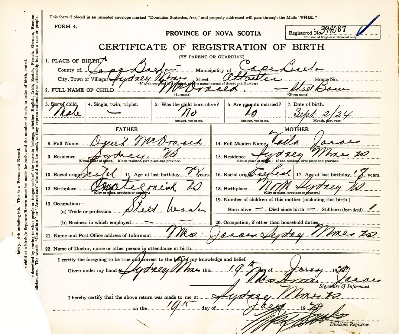 Male Birth Registration: Year: 1924 number: 39400067