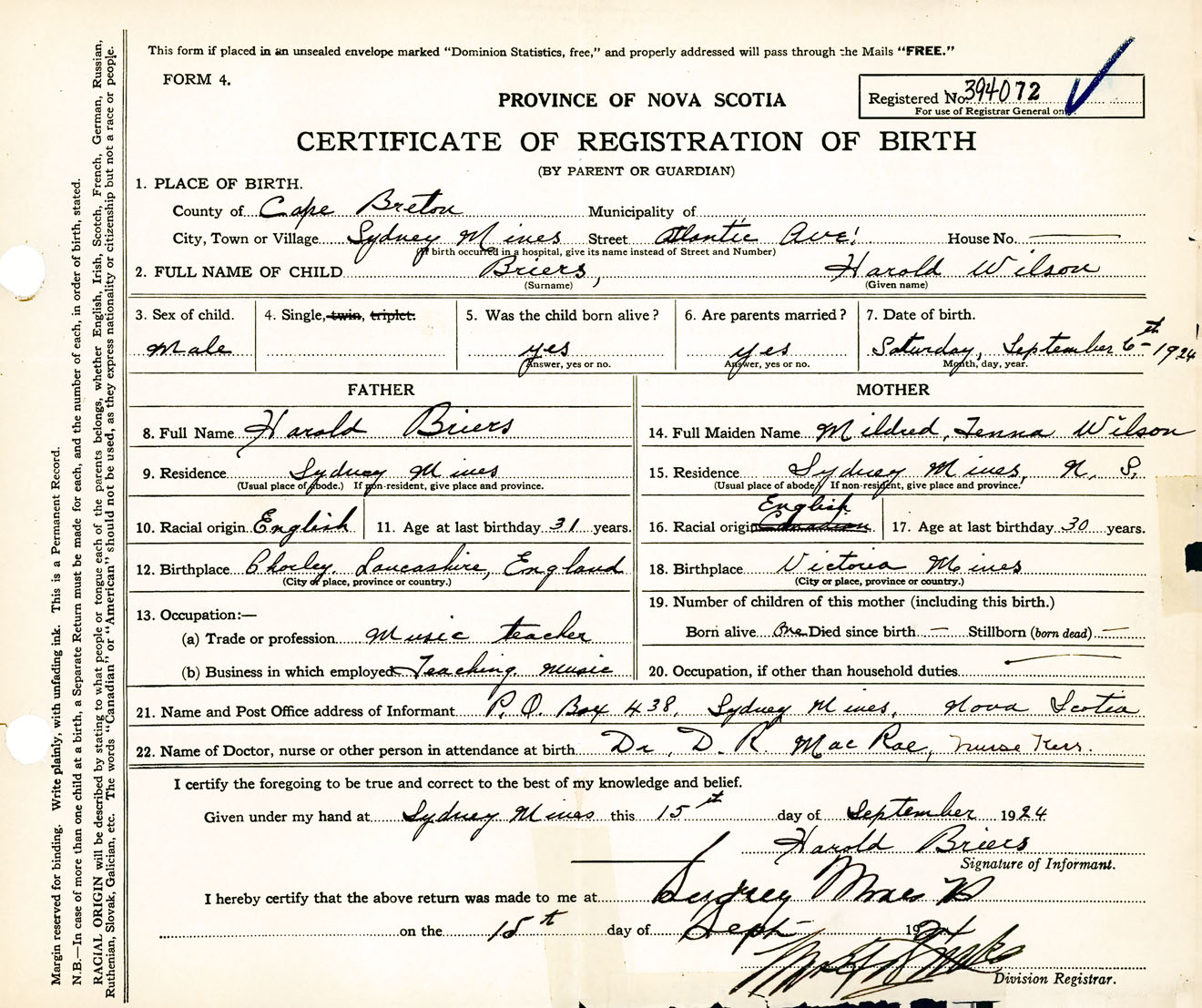 Male Birth Registration: Year: 1924 number: 39400072