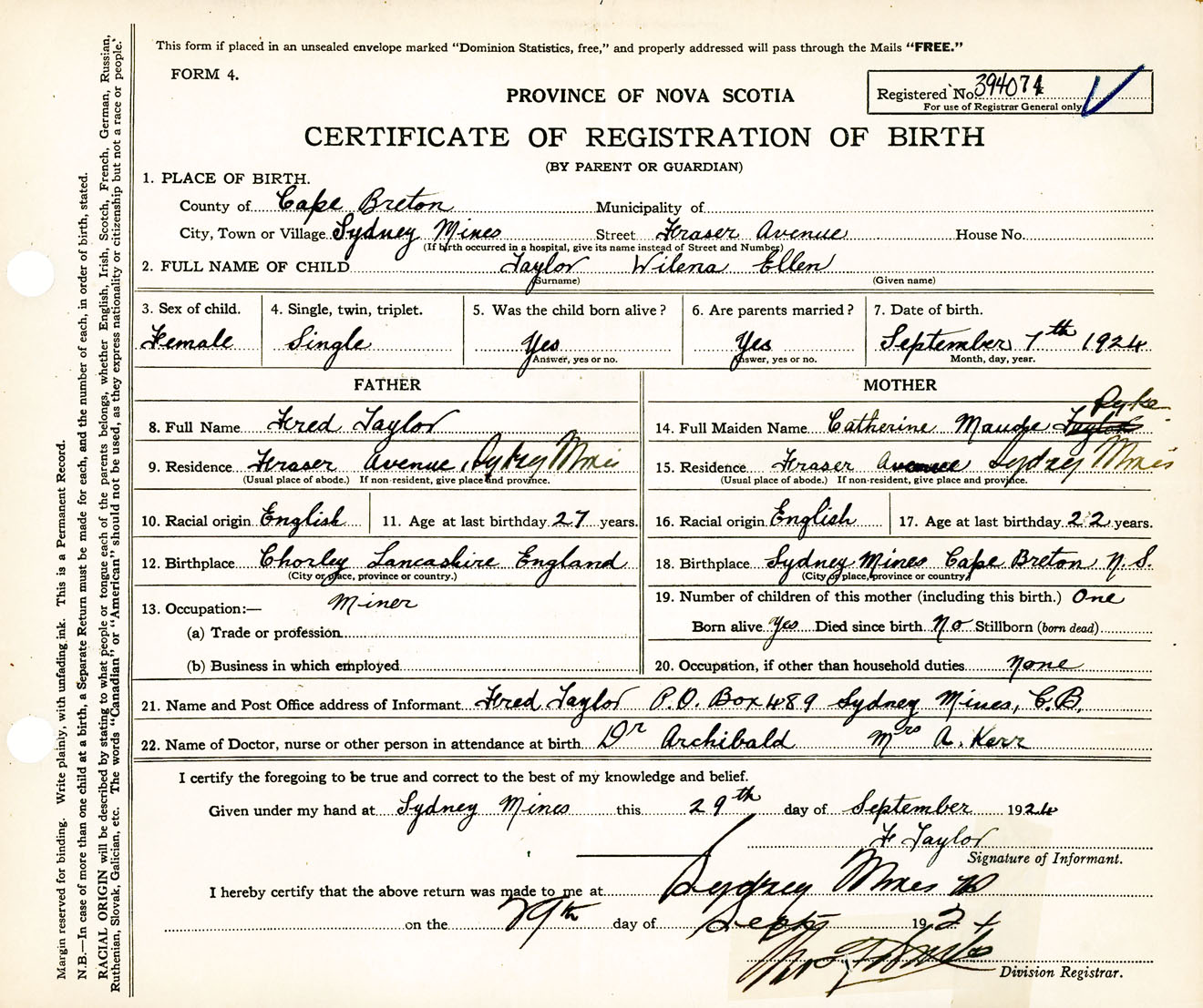 Female Birth Registration: Year: 1924 number: 39400074