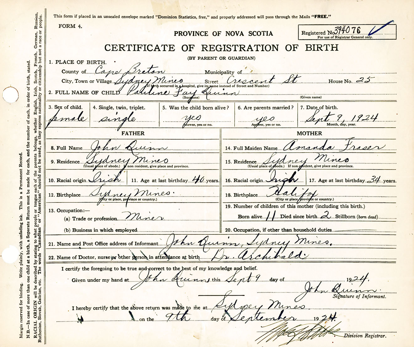 Female Birth Registration: Year: 1924 number: 39400076