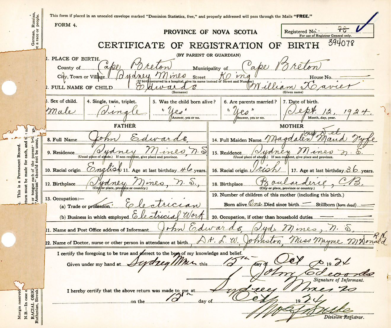 Male Birth Registration: Year: 1924 number: 39400078
