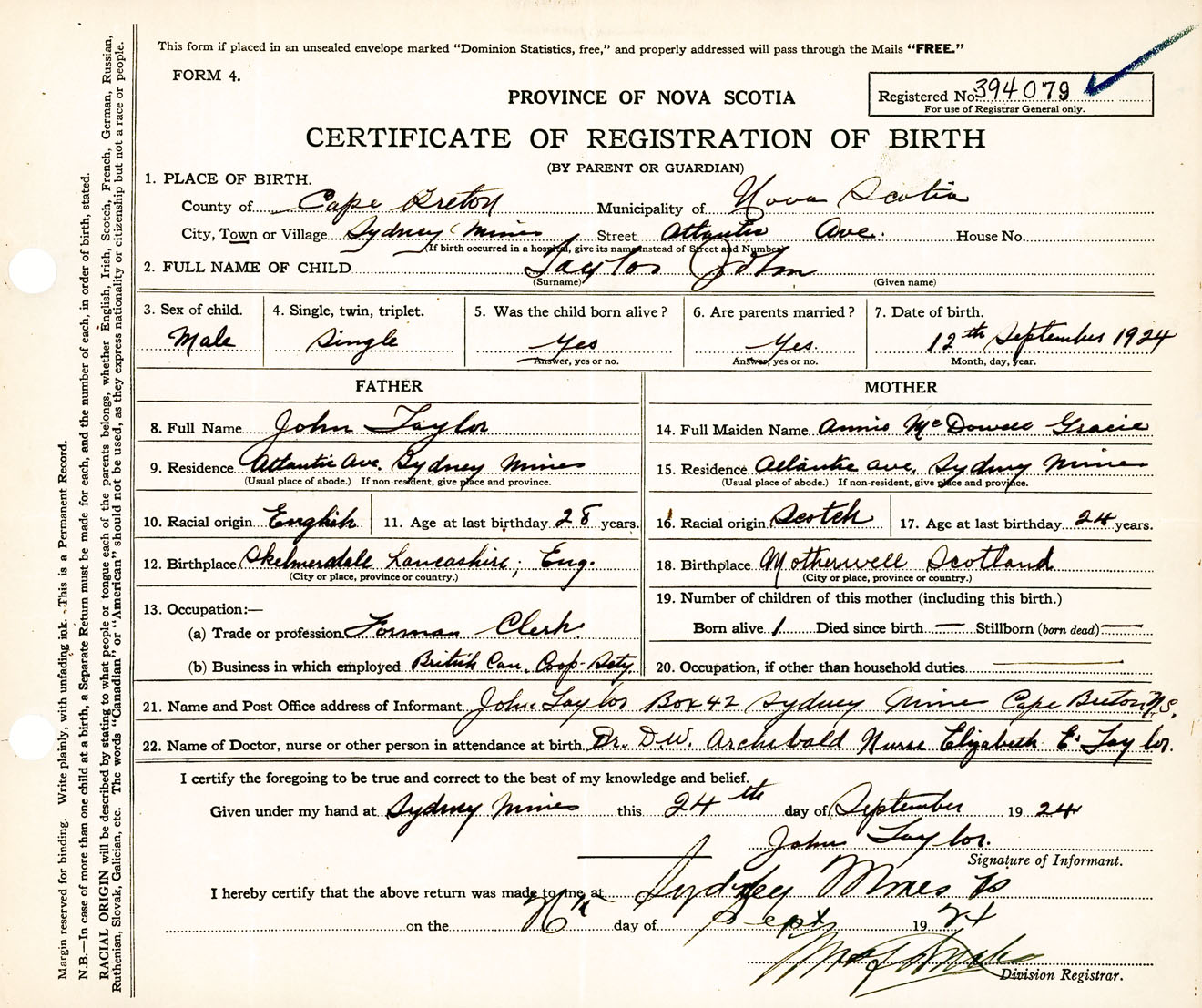 Male Birth Registration: Year: 1924 number: 39400079