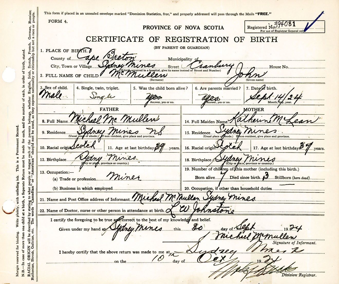 Male Birth Registration: Year: 1924 number: 39400081