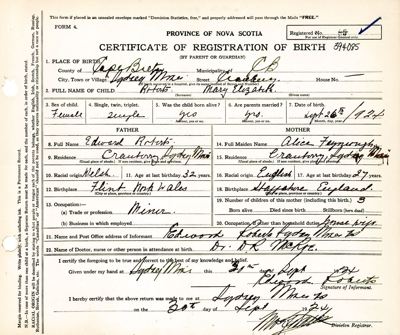 Female Birth Registration: Year: 1924 number: 39400085