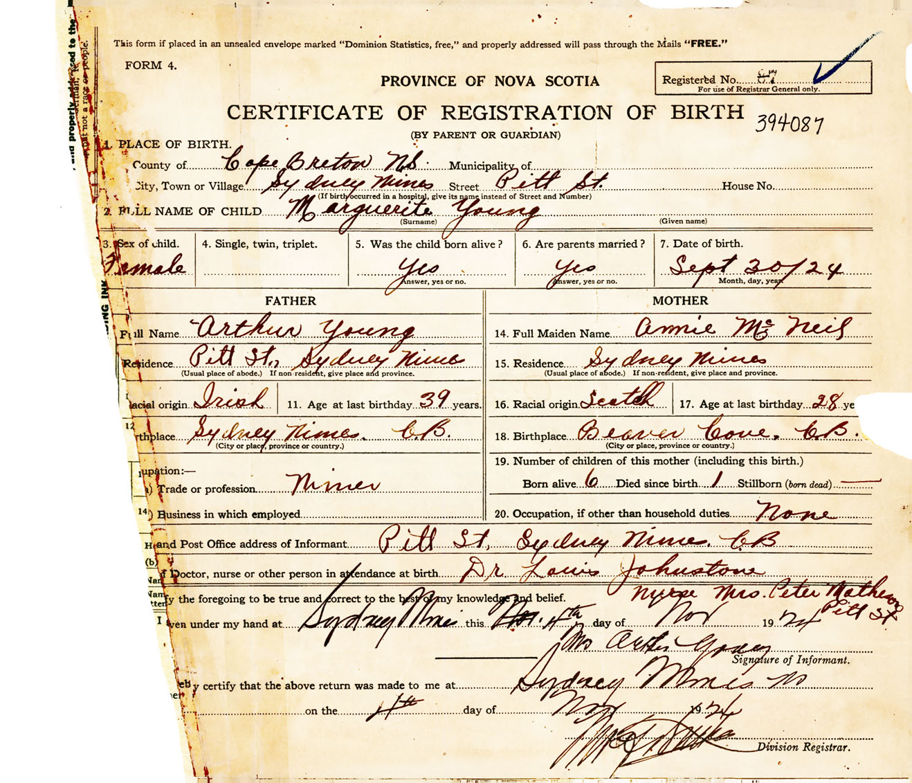 Female Birth Registration: Year: 1924 number: 39400087