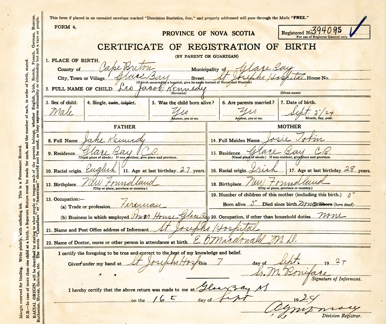 Male Birth Registration: Year: 1924 number: 39400095
