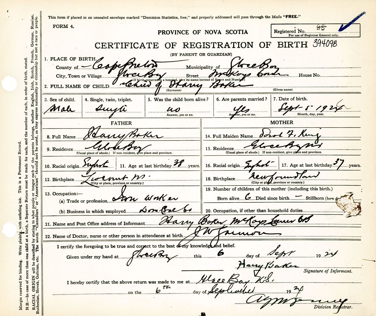 Male Birth Registration: Year: 1924 number: 39400098