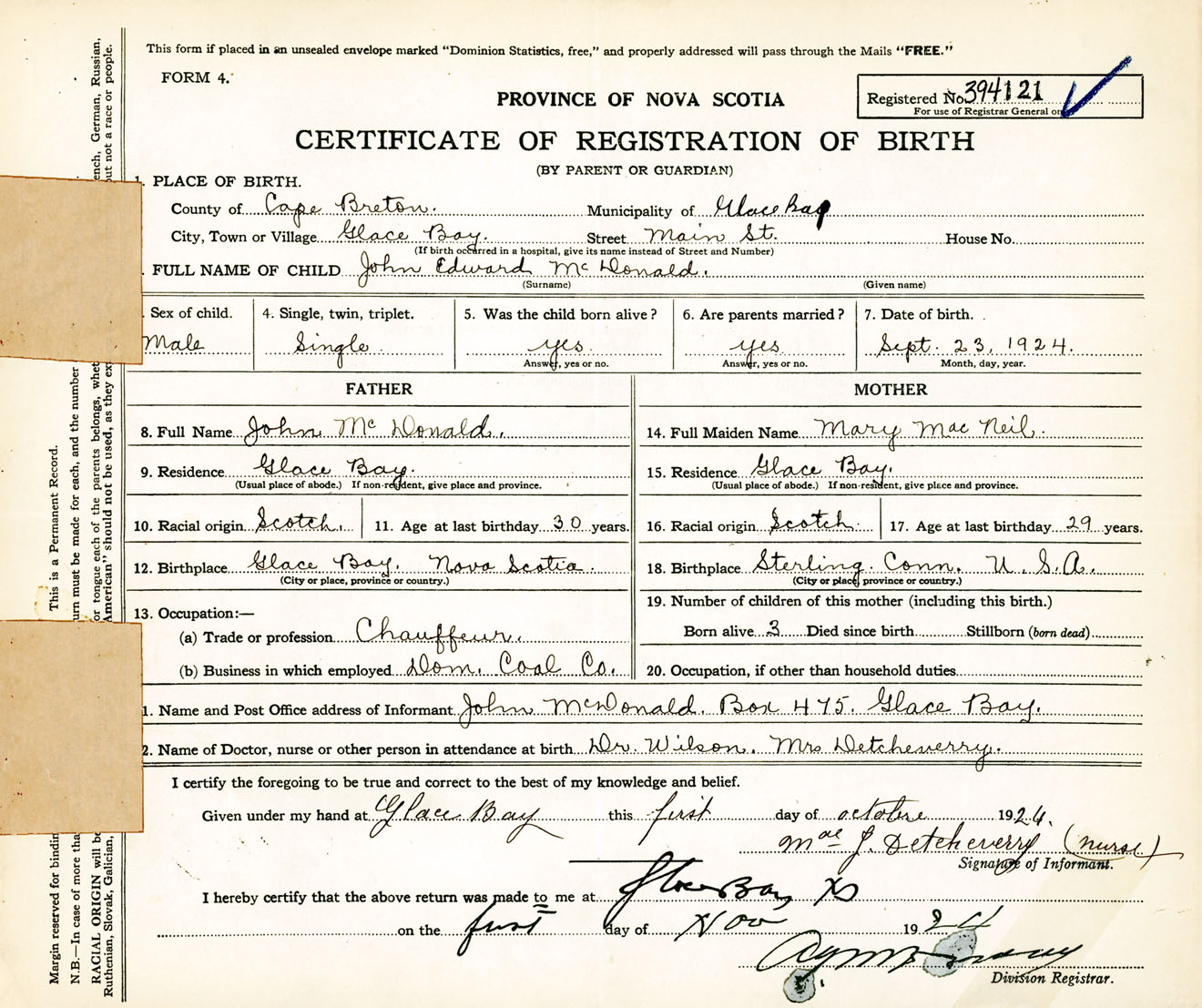 Male Birth Registration: Year: 1924 number: 39400121