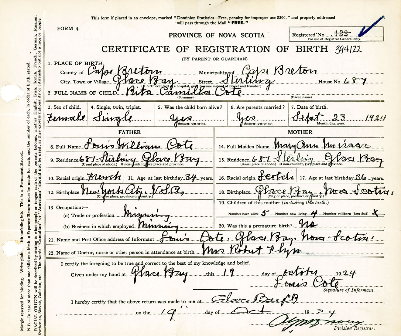 Female Birth Registration: Year: 1924 number: 39400122