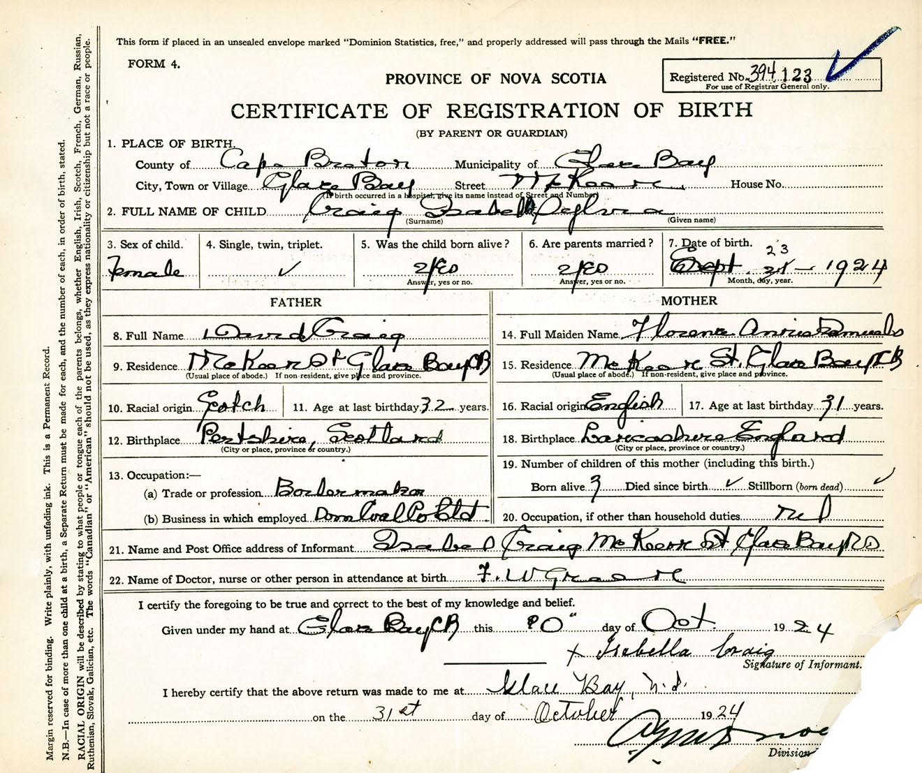 Female Birth Registration: Year: 1924 number: 39400123