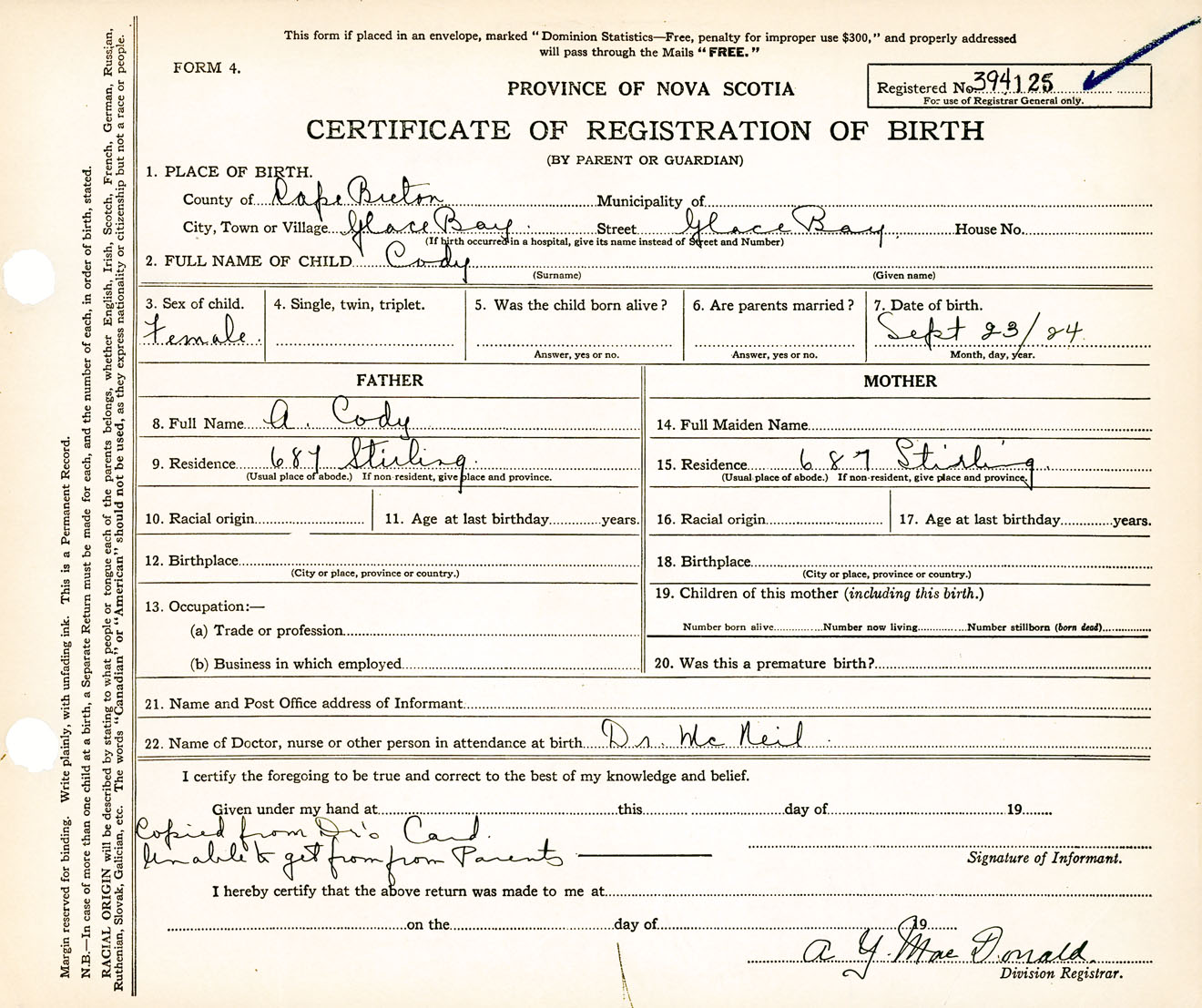 Female Birth Registration: Year: 1924 number: 39400125