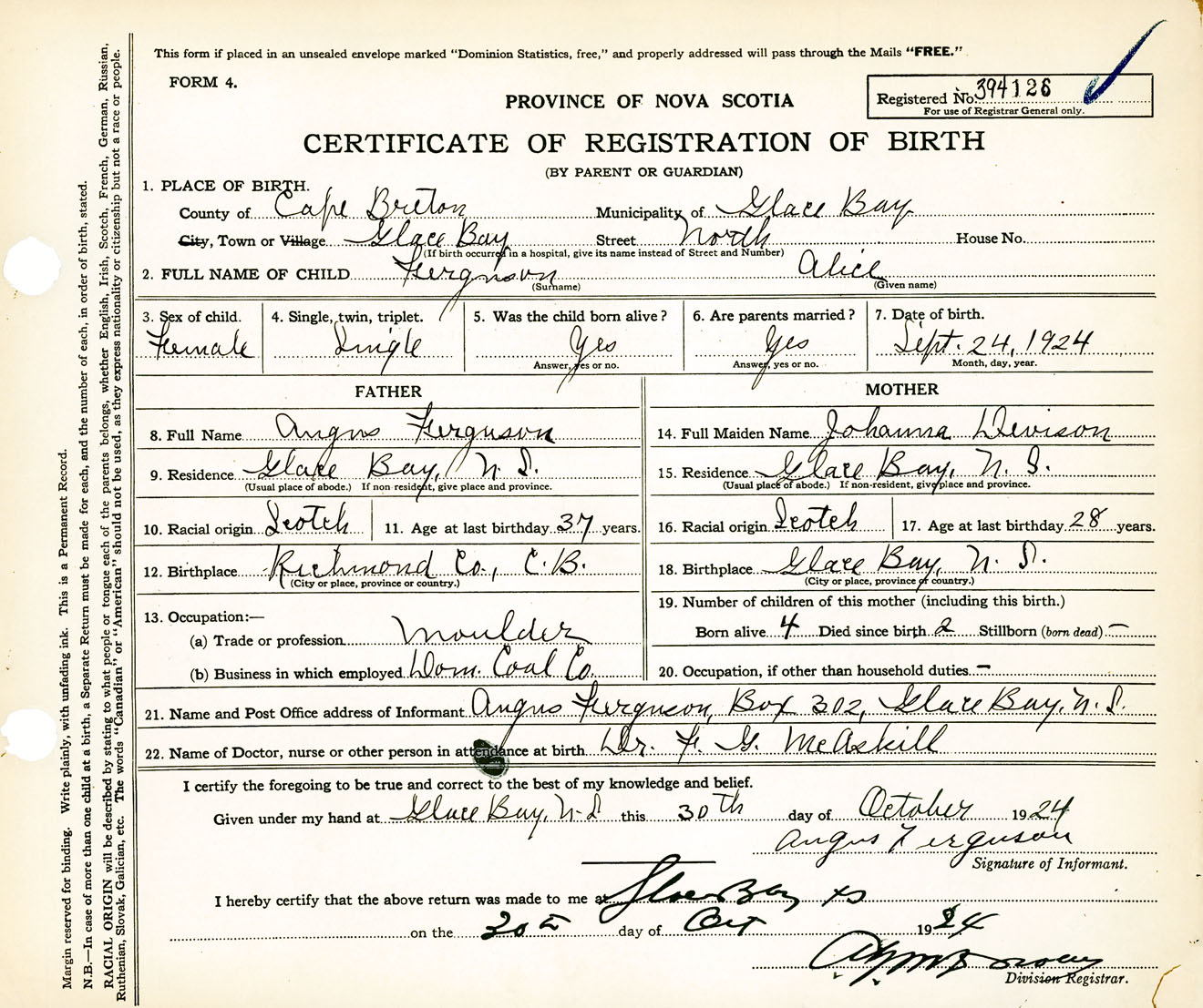 Female Birth Registration: Year: 1924 number: 39400126
