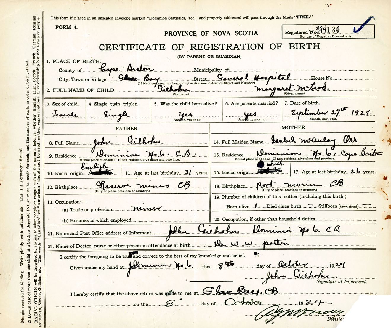 Female Birth Registration: Year: 1924 number: 39400130