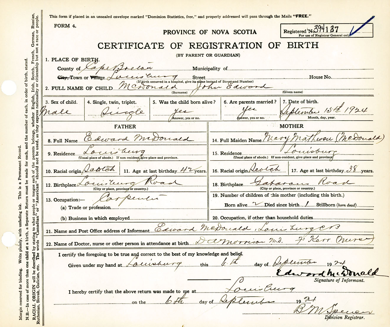 Male Birth Registration: Year: 1924 number: 39400137
