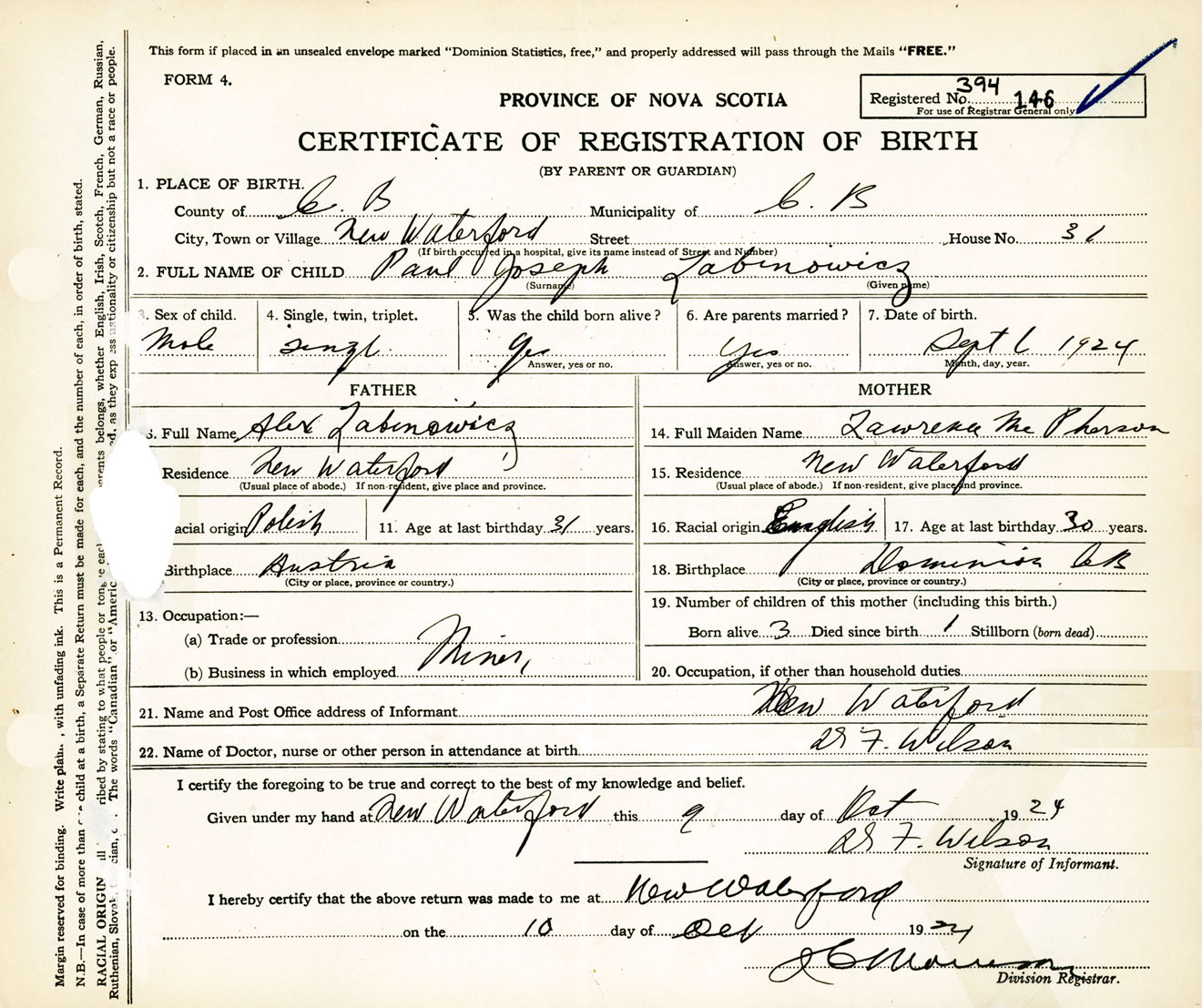 Male Birth Registration: Year: 1924 number: 39400146