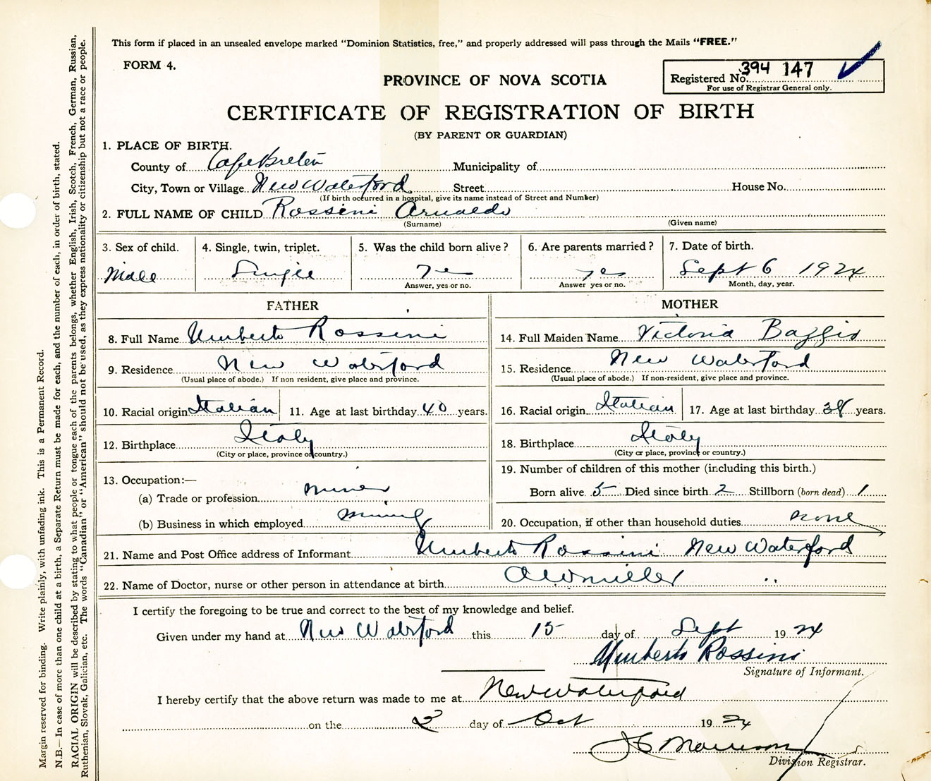 Male Birth Registration: Year: 1924 number: 39400147