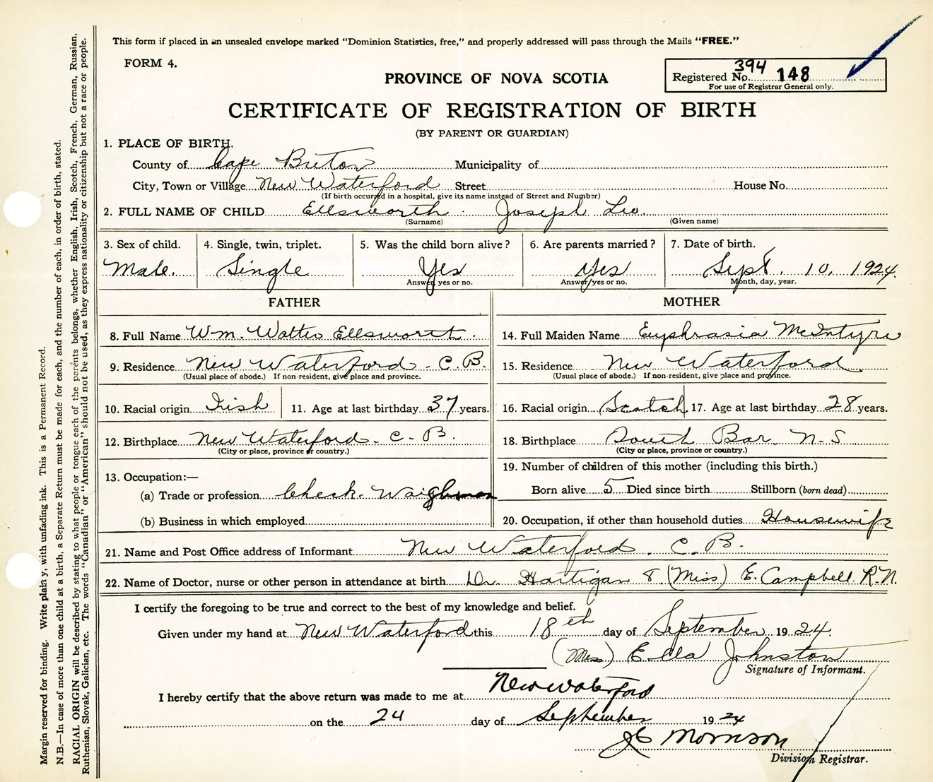 Male Birth Registration: Year: 1924 number: 39400148
