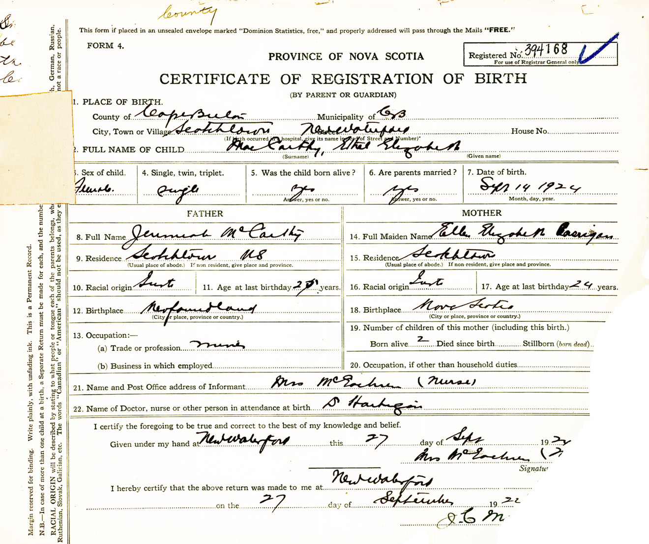 Female Birth Registration: Year: 1924 number: 39400168
