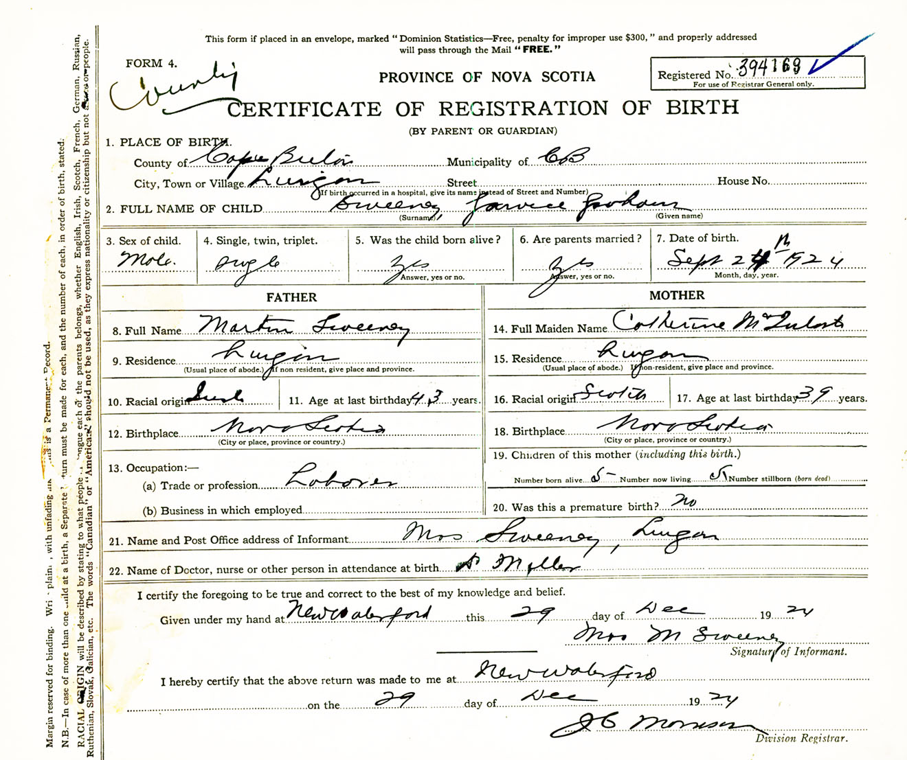 Male Birth Registration: Year: 1924 number: 39400169